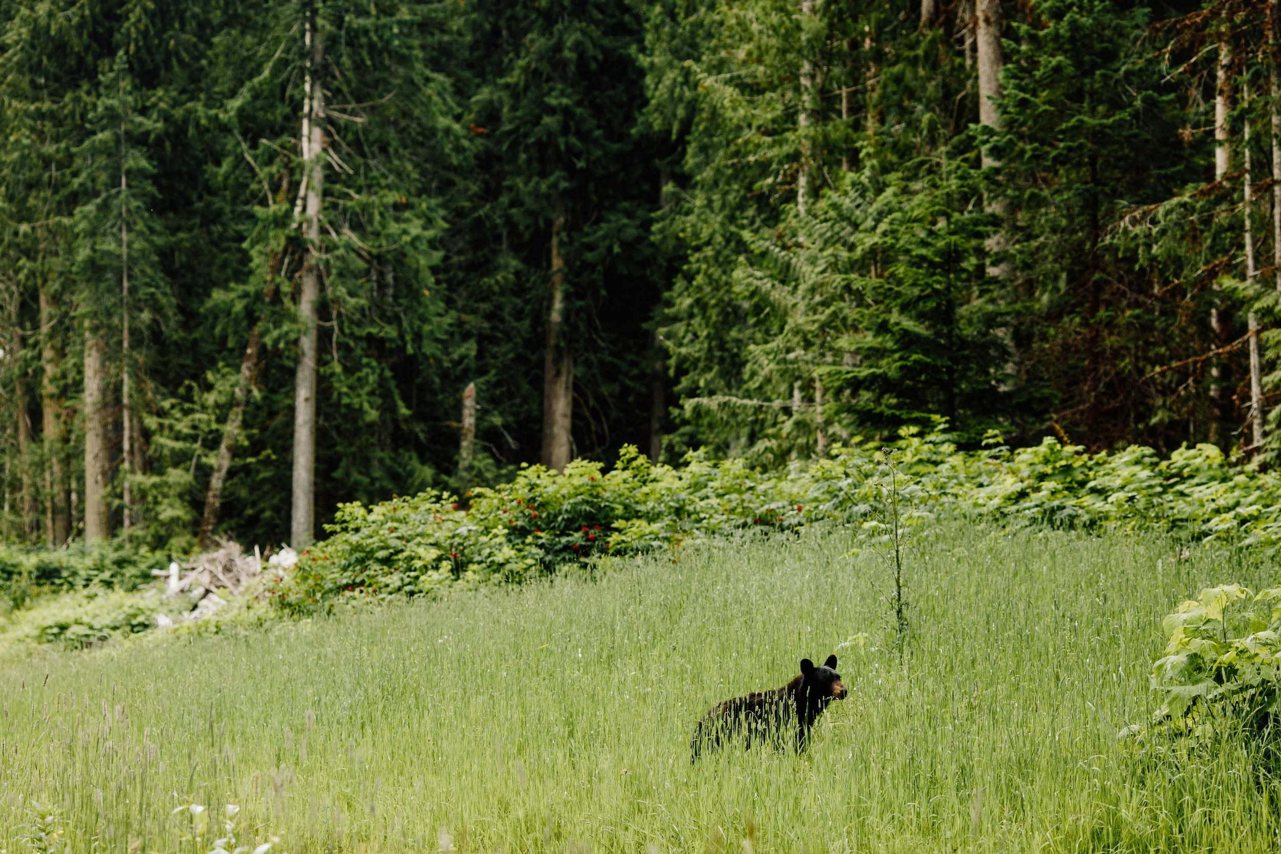 A black bear rests beside a logging road cut through the inland temperate rainforest.